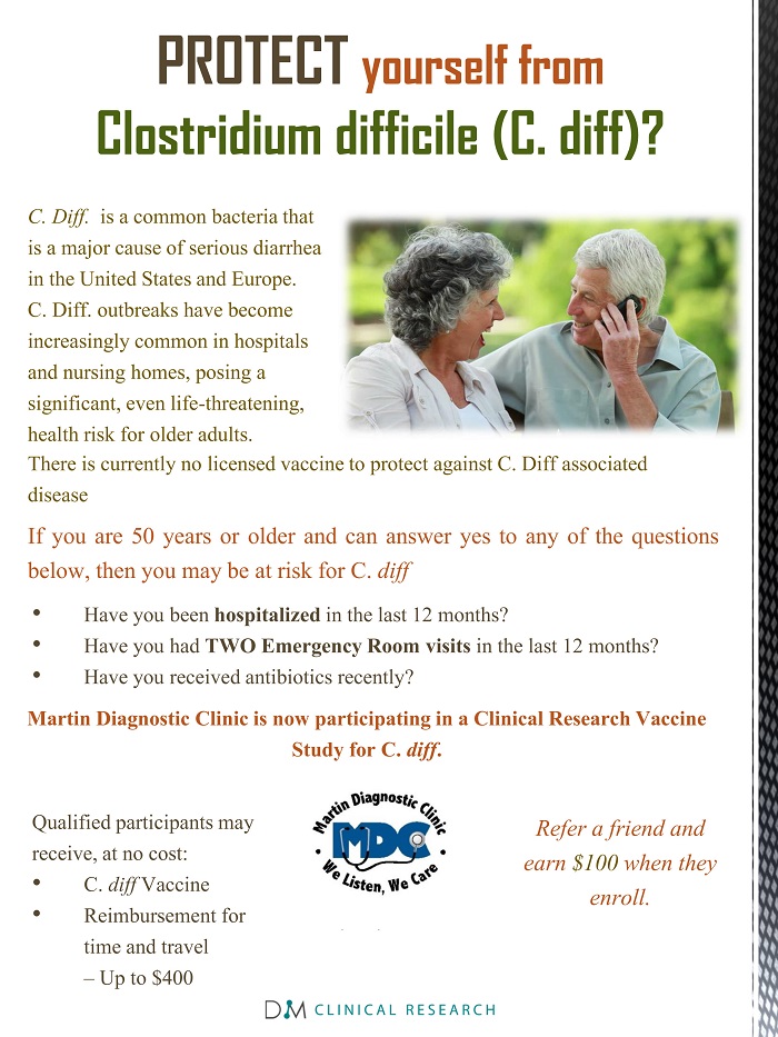- C diff vaccine free of cost - Compensation for time and travel - Research doctor visits