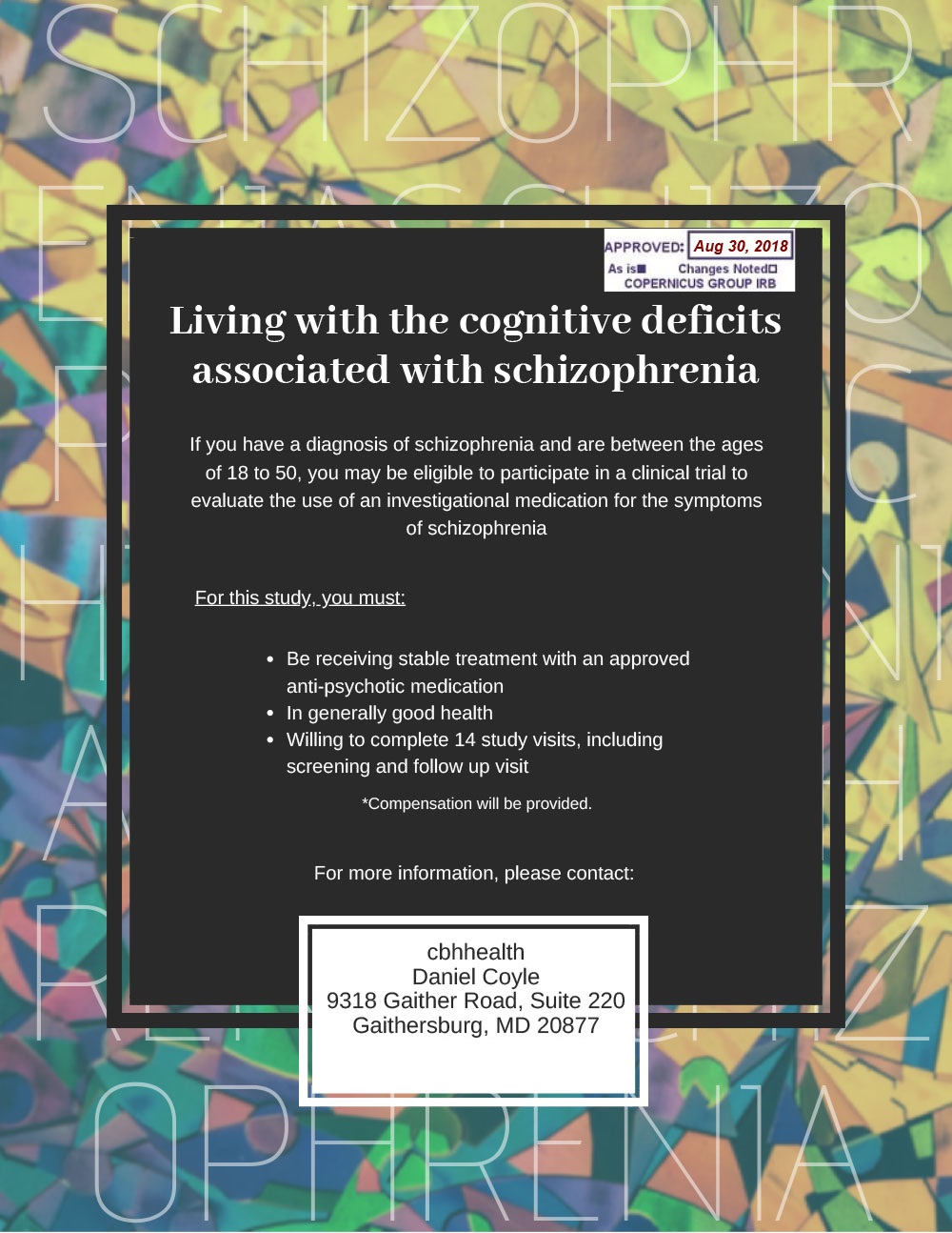 The purpose of this study is to evaluate the effectiveness and safety of an investigational compound for schizophrenia. The study consists of a 24 week outpatient study treatment period, followed by a safety follow up period. All procedures and study visits will take place at CBH Health located in Gaithersburg, MD.