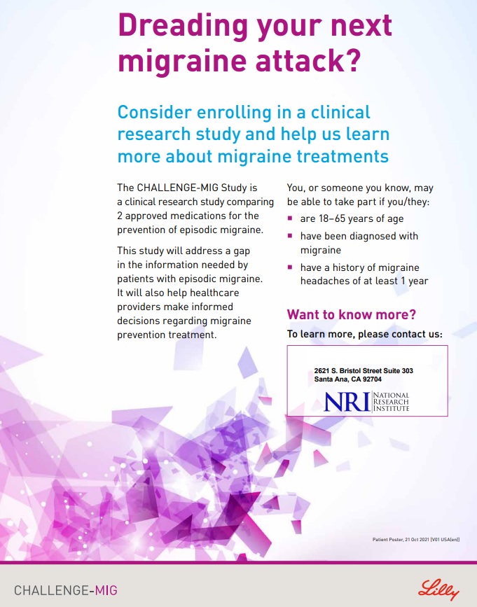 Click image to enlargeNational Research Institute is enrolling participants in a clinical research study for migraine headaches. Insurance is not needed to participate in this study.