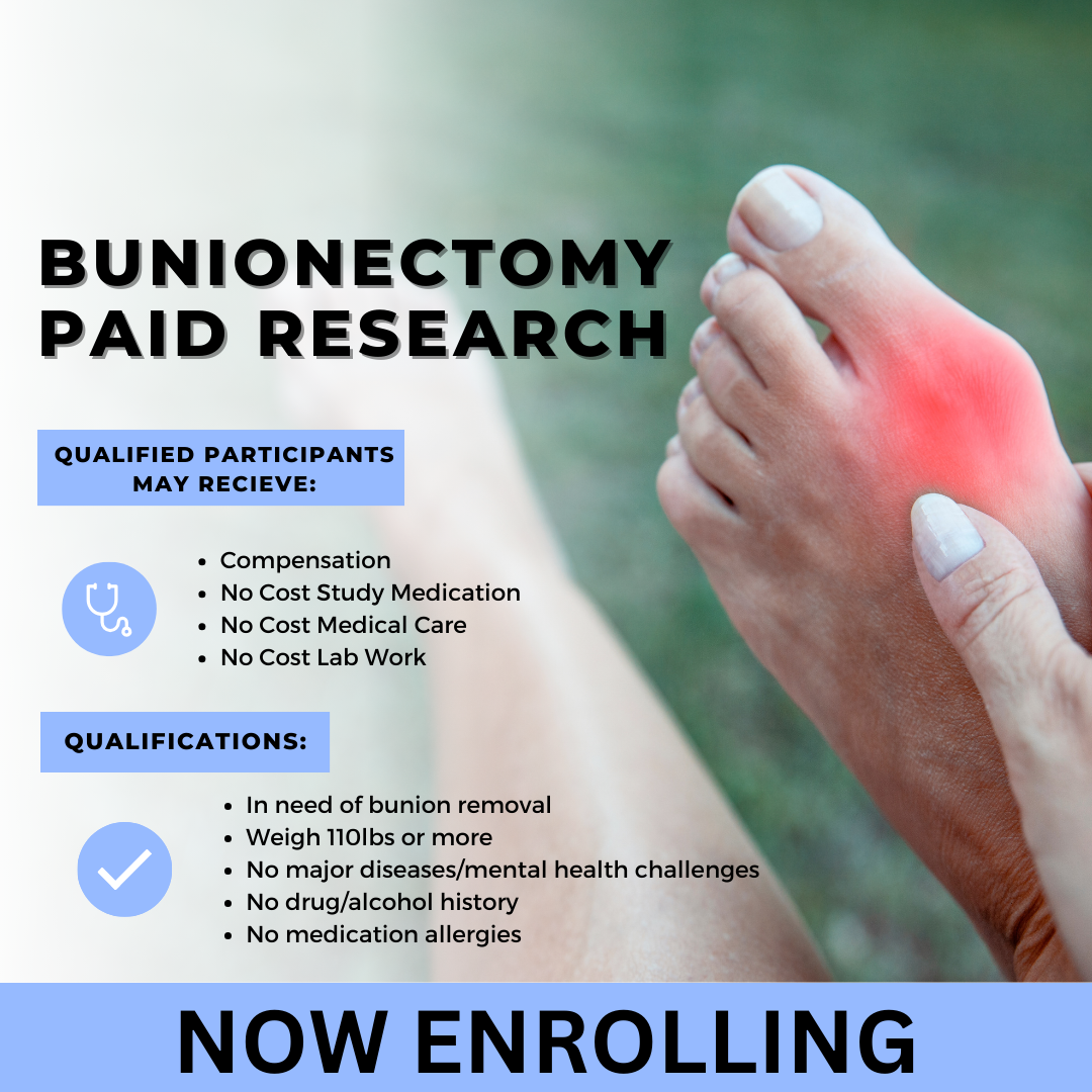 Click image to enlargeHealthy adults aged 18-64 years and older are needed to participate in the study of new pain medication after free Bunionectomy. Spots are limited- CALL NOW! REFER A FRIEND THAT QUALIFIES AND RECIEVE A BONUS!