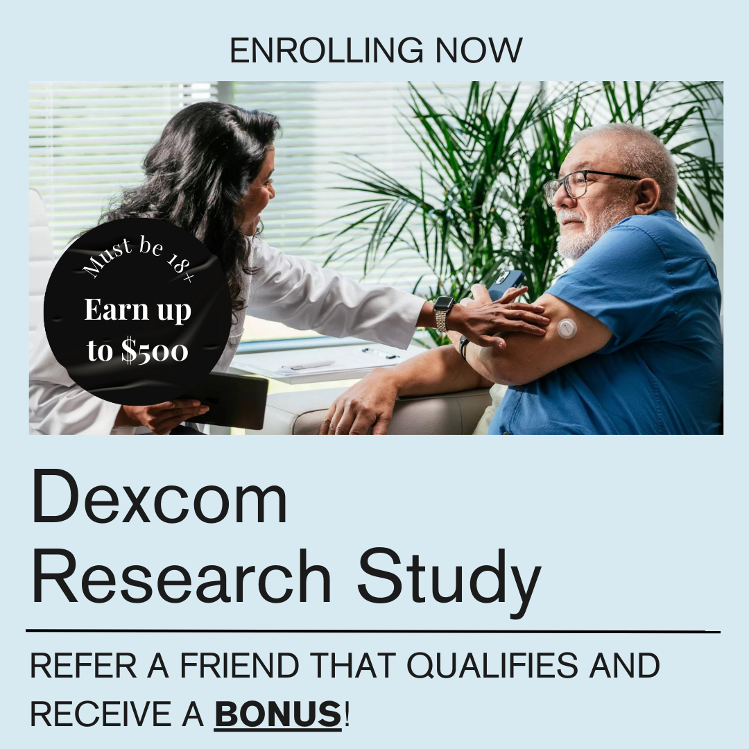 Click image to enlargeWe are seeking volunteers with Diabetes to apply to our study. You must have the Dexcom device. Apply now to participate. Refer a friend who qualifies, and receive a BONUS! Call NOW!