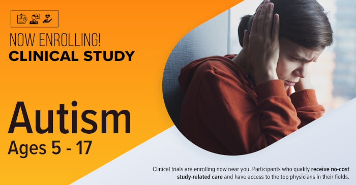 Autism study enrolling now. Join a Autism clinical study today and receive: No-cost study-related care and study treatment Potential financial compensation Study-related care from the top physicians for Autism at no-cost