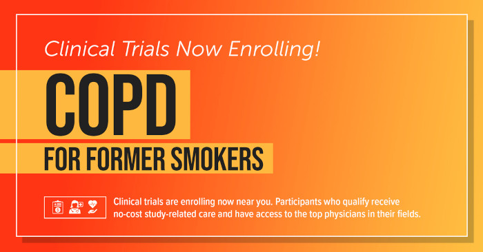 COPD study enrolling now. Join a COPD clinical study today and receive: No-cost study-related care and study treatment Potential financial compensation Study-related care from the top physicians for COPD at no-cost